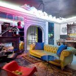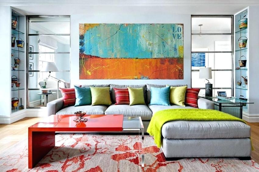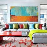 Elija entre una paleta de colores llamativos para crear un ambiente festivo vibrante en su sala de estar. Esto le dará al interior una alegría, que se muestra claramente en las fotos de los muebles para el pasillo. Una buena solución es utilizar tonos violeta intenso, naranja apagado, azul cielo, azul profundo, burdeos, verde botella y menta. Sin embargo, debe recordarse: para que la sala de estar no sea demasiado colorida y no canse la vista, se prefieren 1-2 colores brillantes.