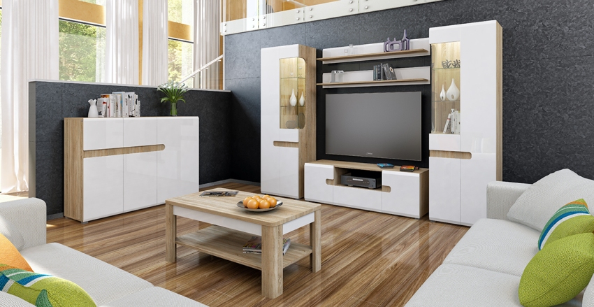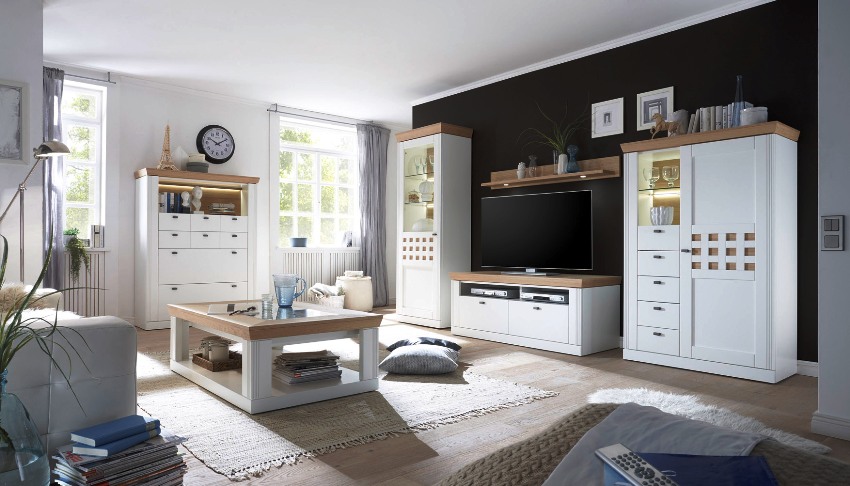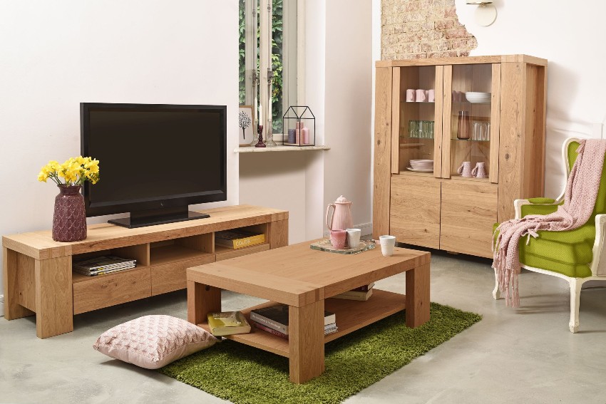 Los muebles de madera natural se utilizan en colores naturales. Son populares los productos elaborados con maderas como cerezo, teca, fresno de montaña, pino, roble de pantano y acaju, con una tonalidad, granulosidad y transición de tonos característicos. Los muebles blancos, beige, amarillos, naranjas, oliva, terracota y burdeos también encajarán armoniosamente en el interior de la sala de estar.