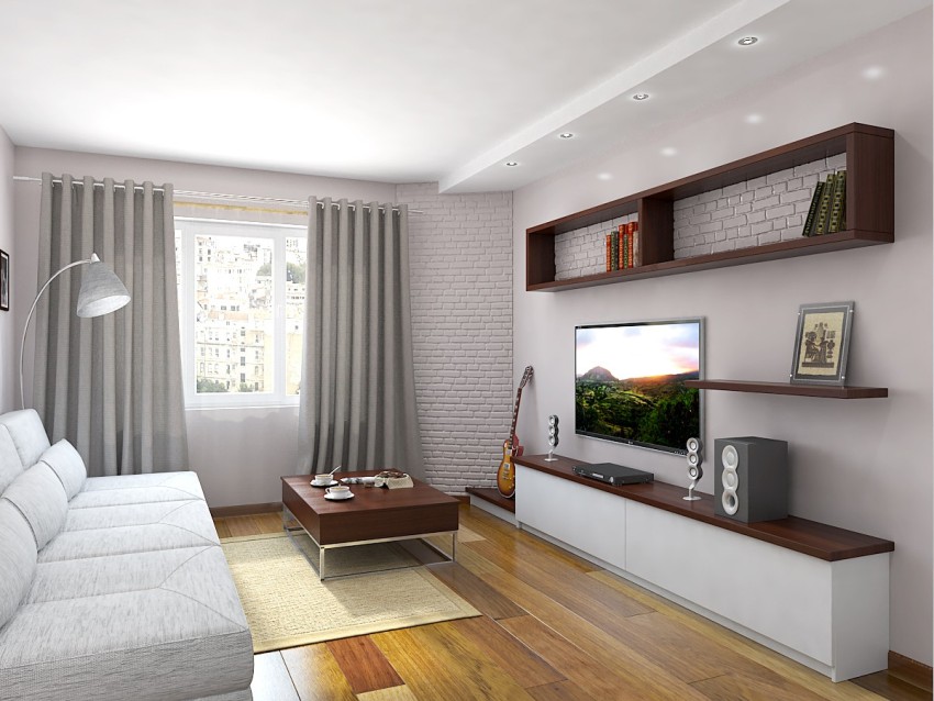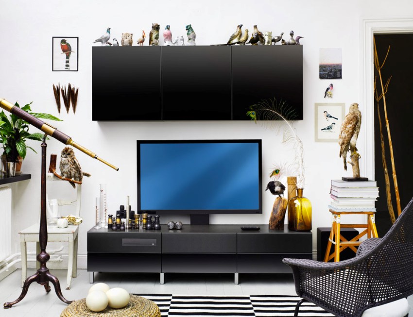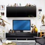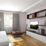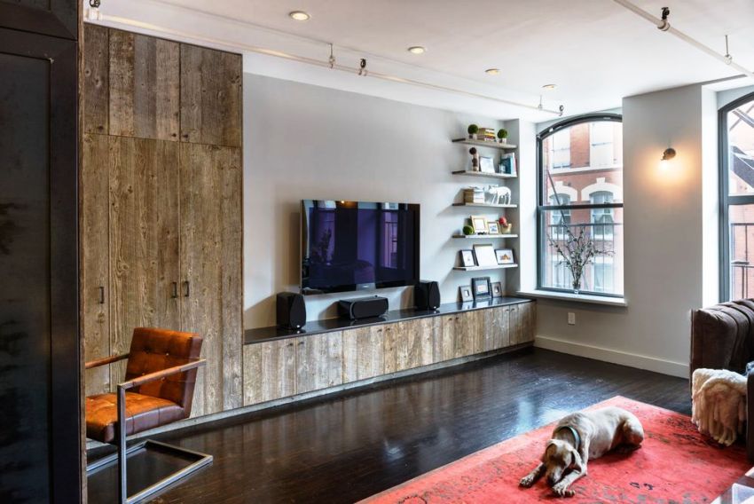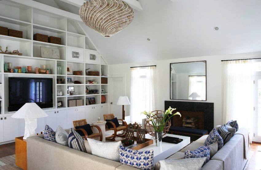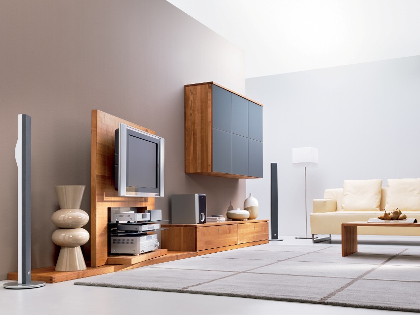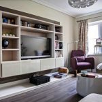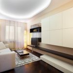 ¡Aviso util! La disposición lineal también implica la instalación de armarios altos en los lados, y varios estantes se cuelgan sobre el soporte de TV bajo central.