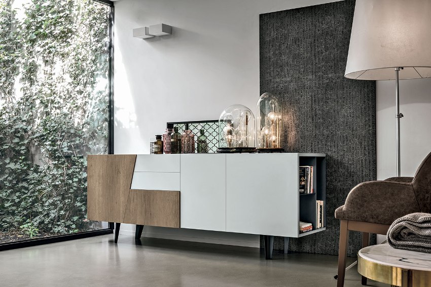Los sistemas modulares pueden estar hechos de madera maciza, aglomerado y aglomerado laminado. El diseño exquisito y exclusivo del producto se adquiere mediante el uso de vidrio, plástico modificado, espejos y revestimientos.