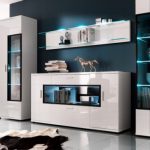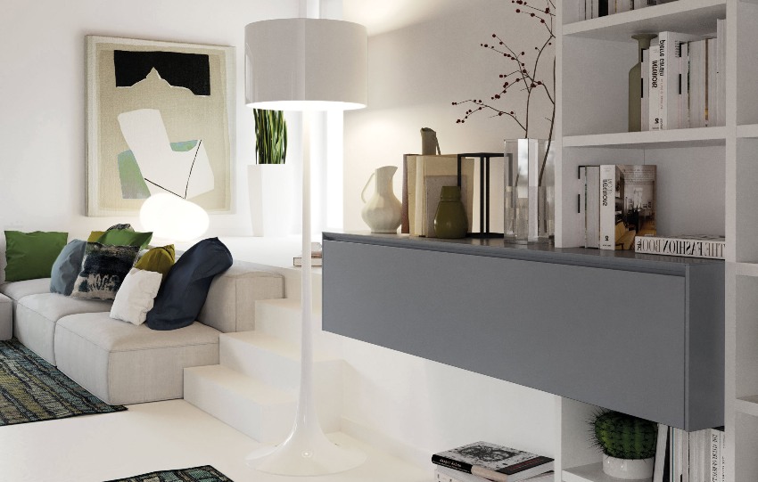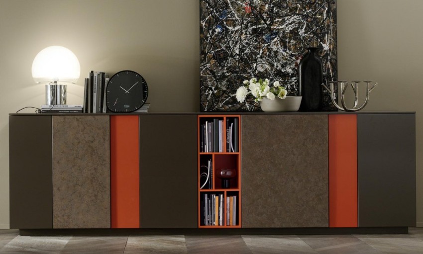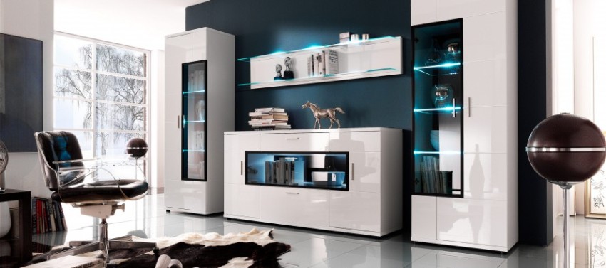Muebles de gabinete para la sala de estar en un estilo moderno: estanterías y aparadores.