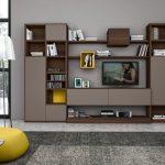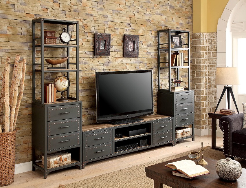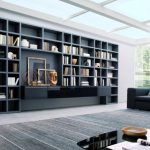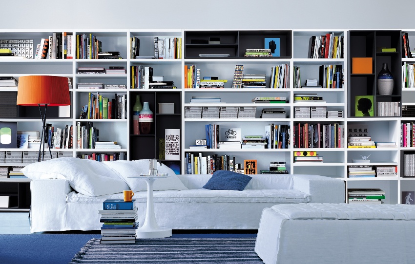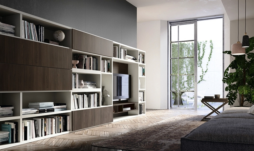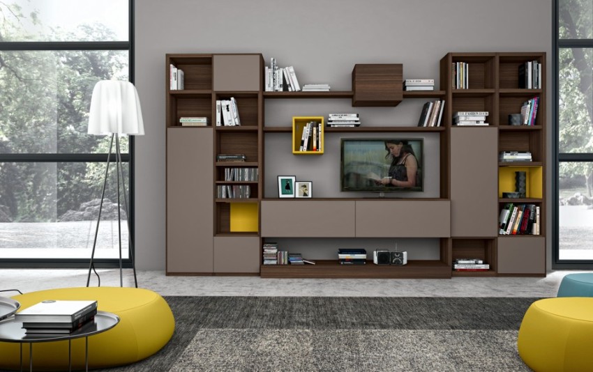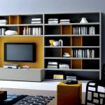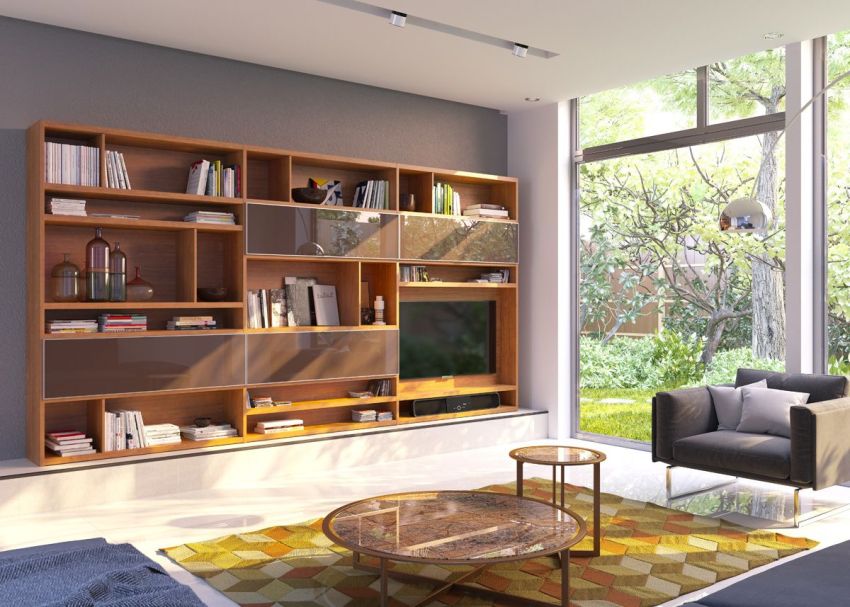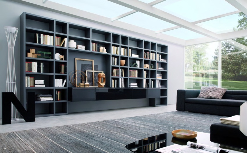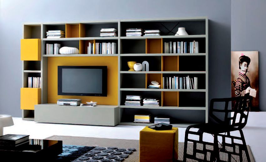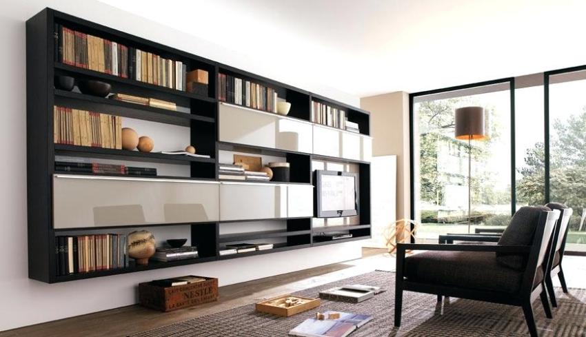 Los modelos modernos de estanterías pueden consistir en estantes, equipados con cajones, vitrinas cerradas o estantes en voladizo que van más allá del marco principal. También hay opciones con un estante para TV.
