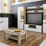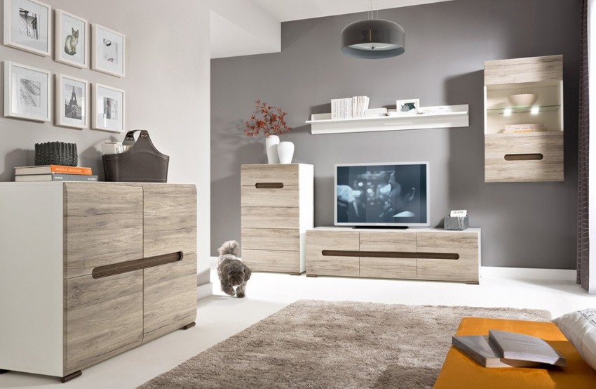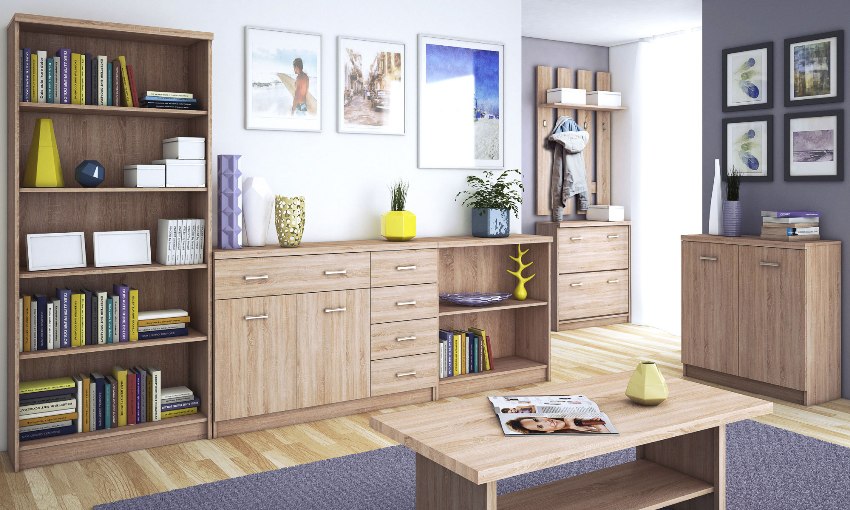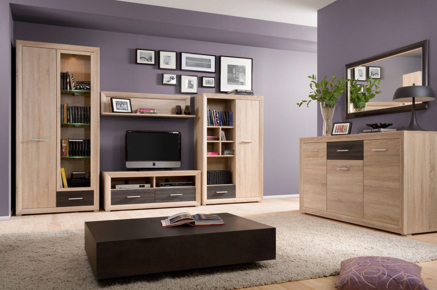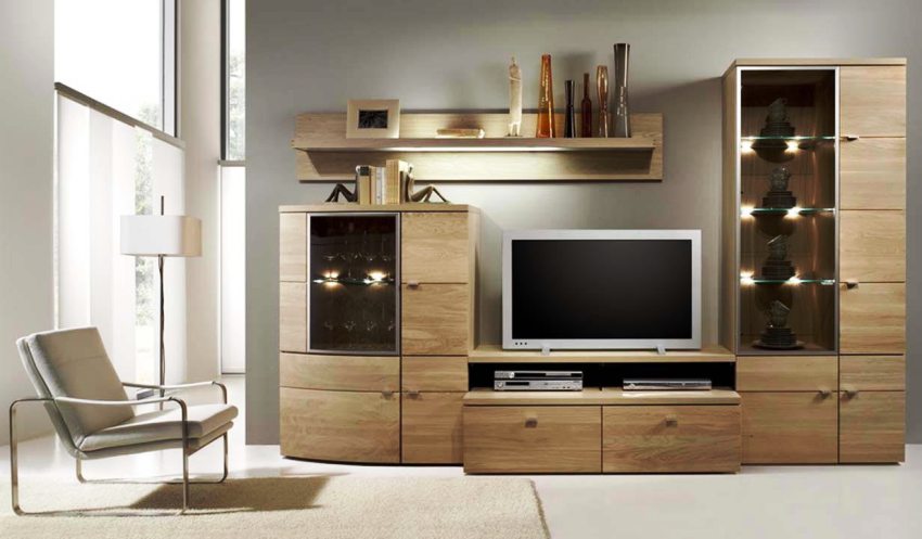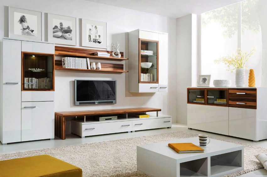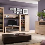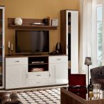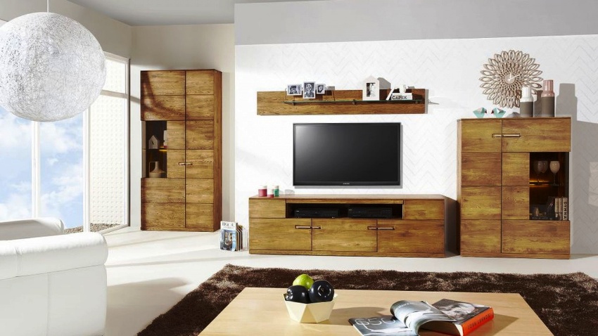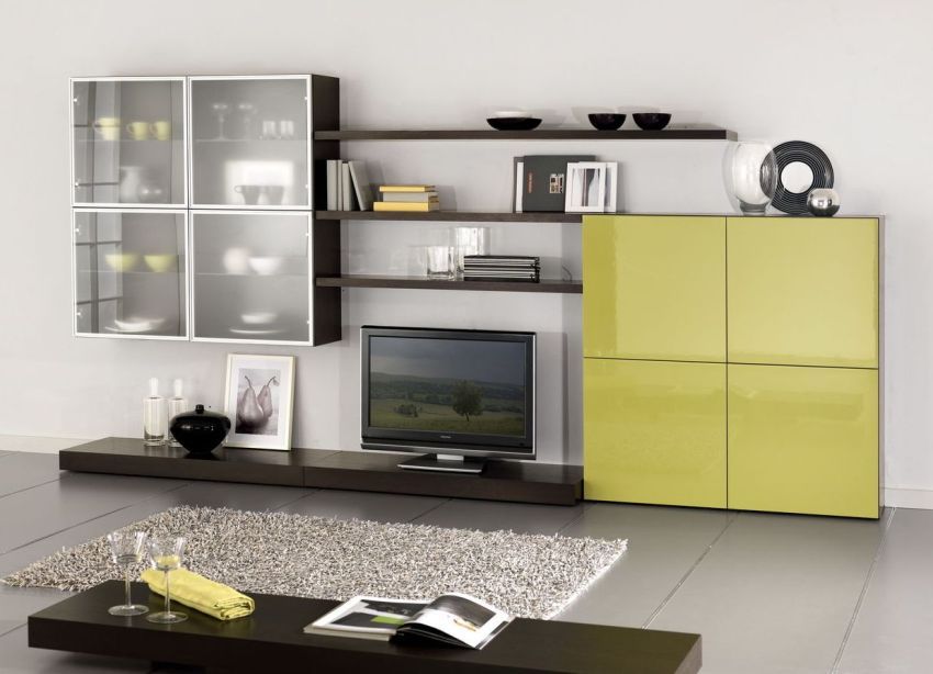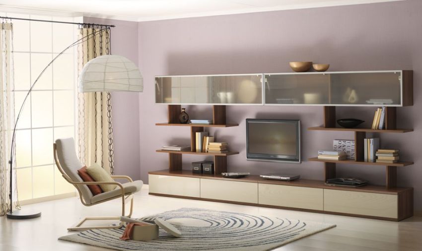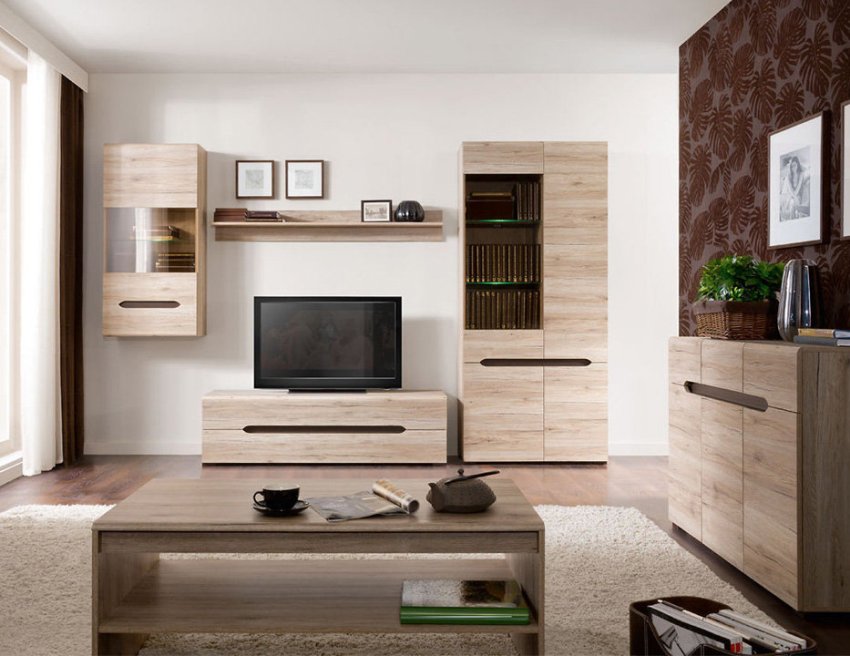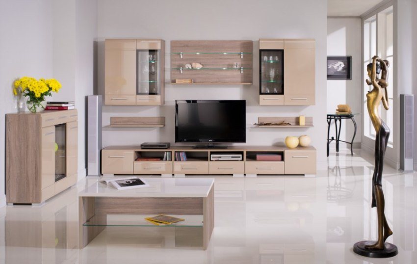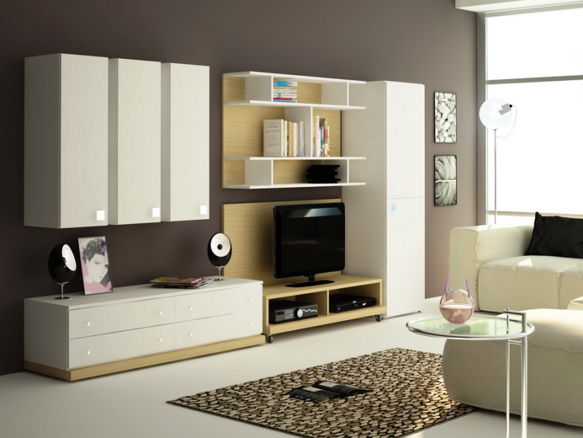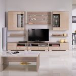 Hay aparadores especiales o vitrinas de vidrio para acomodar platos. Para crear una mini biblioteca, debe haber muchos estantes con poco espacio entre ellos. Muebles de sala para TV, equipo de audio, equipo de video contiene estantes grandes. Además, el conjunto puede incluir cajones inferiores, aparadores, estantes para artículos decorativos, estuches para lápices para cosas.