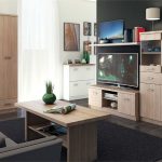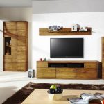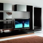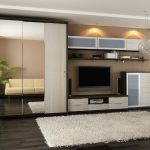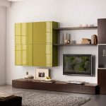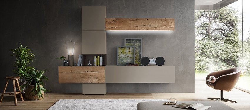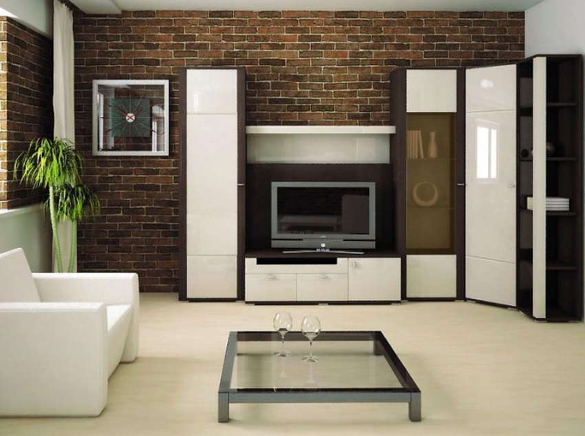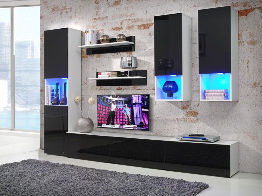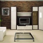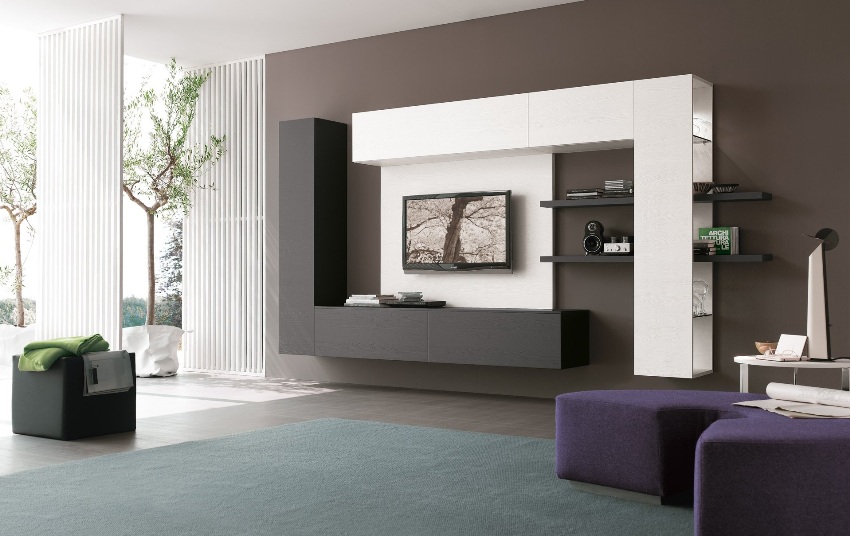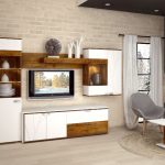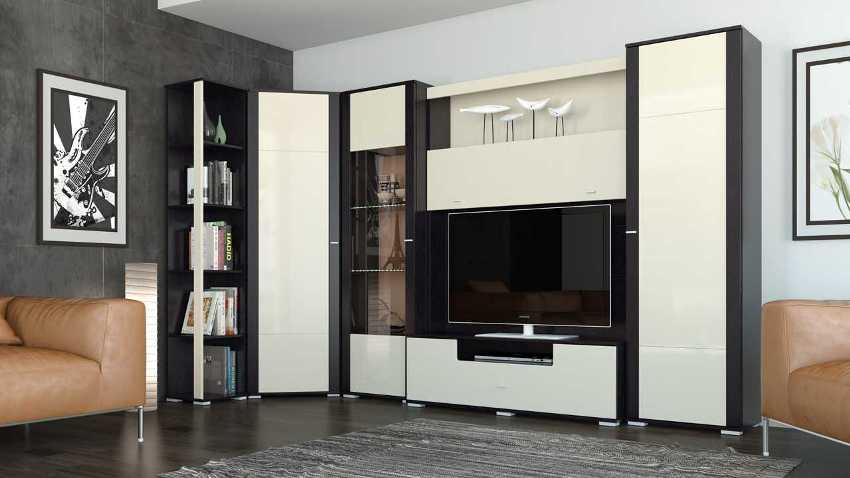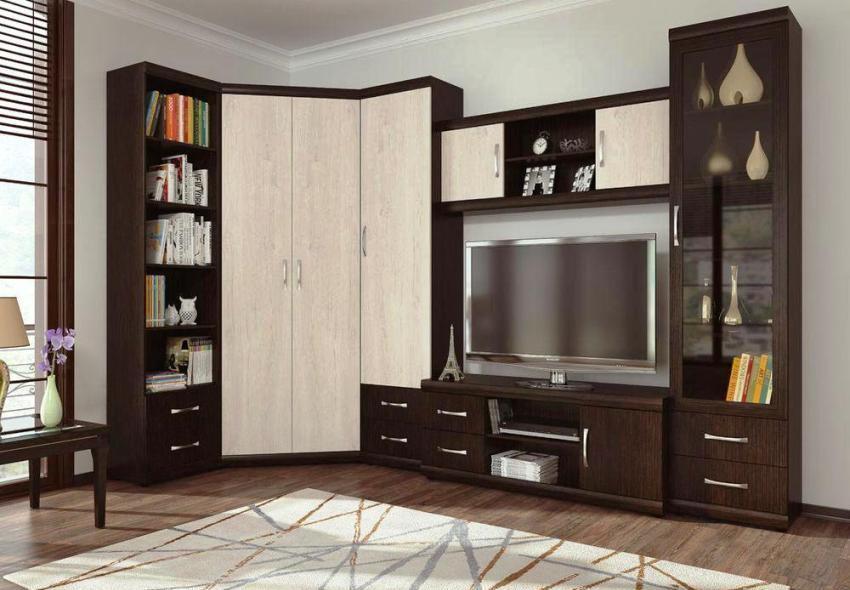 Un armario actúa como un módulo de esquina, en cuyos lados hay armarios bajos o cajas de piso cerradas, y encima de ellos hay estantes abiertos. También hay otra versión de la estructura de la esquina, donde se ubica un soporte bajo con un televisor en la esquina. Encima se cuelgan estantes abiertos. Los racks se instalan en ambos lados. La pared de la esquina para la sala de estar también proporciona una disposición asimétrica de las secciones, lo que permite crear una composición de muebles única.