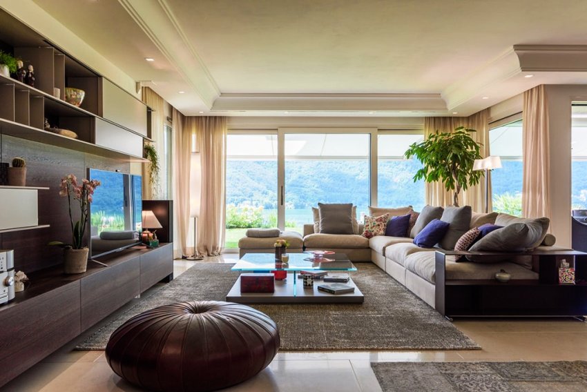 Al elegir la opción de muebles tapizados en la sala de estar, se deben tener en cuenta las dimensiones de la habitación. En una habitación pequeña, será suficiente colocar un sofá en un tono claro, en uno espacioso; debe complementarse con un par de sillones y pufs. En este último caso, puede experimentar con los colores de los muebles y elegir tonos saturados más oscuros.