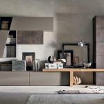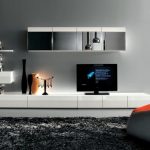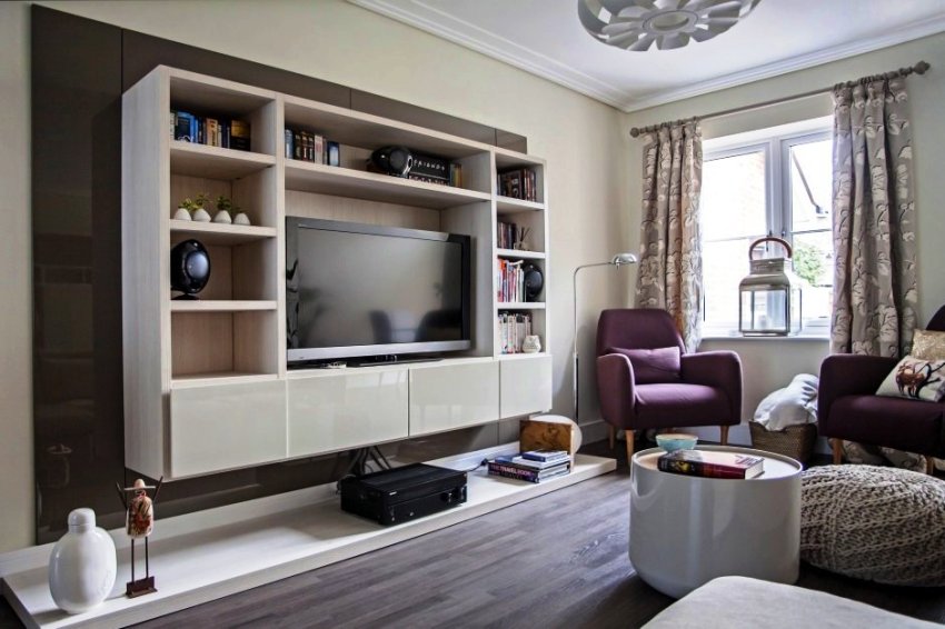 El bastidor puede ser lineal, angular o escalonado. Se pueden ver diferentes opciones en la foto de los muebles de la sala de estar en un estilo moderno. Según el método de instalación, se distinguen los modelos clásicos, instalados en cuatro soportes, empotrados, que se montan en un nicho y se suspenden, se fijan a la pared. Los dos primeros tipos son capaces de soportar cargas importantes. Los modelos colgantes están diseñados para acomodar elementos decorativos, plantas vivas y peluches. La profundidad del bastidor es de 40-55 cm.