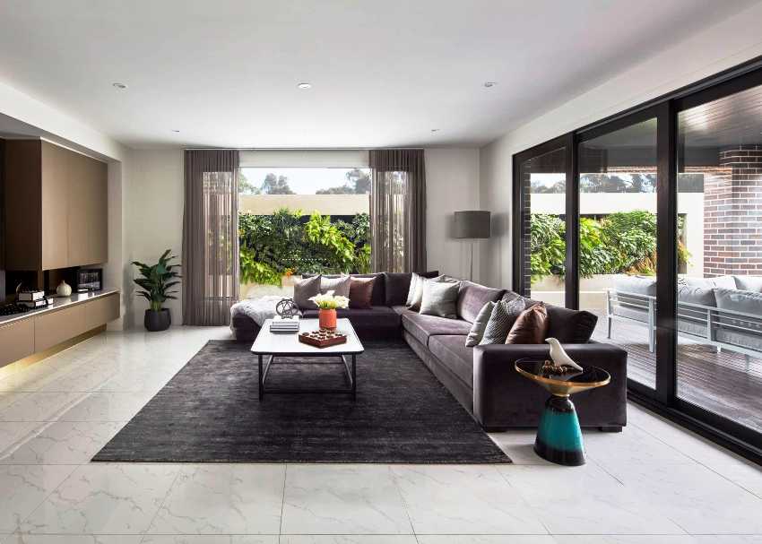 El material de tapicería para muebles tapizados de sala de estar moderna debe seleccionarse en función de consideraciones prácticas, ya que la habitación se caracteriza por un alto tráfico. Debe caracterizarse por su fuerza, resistencia al desgaste y textura suave. Los textiles, el cuero y el cuero ecológico cumplen estos requisitos. Los productos de cuero suave se caracterizan por su practicidad, durabilidad, resistencia a la humedad y respeto al medio ambiente. Esta opción es ideal para interiores clásicos.