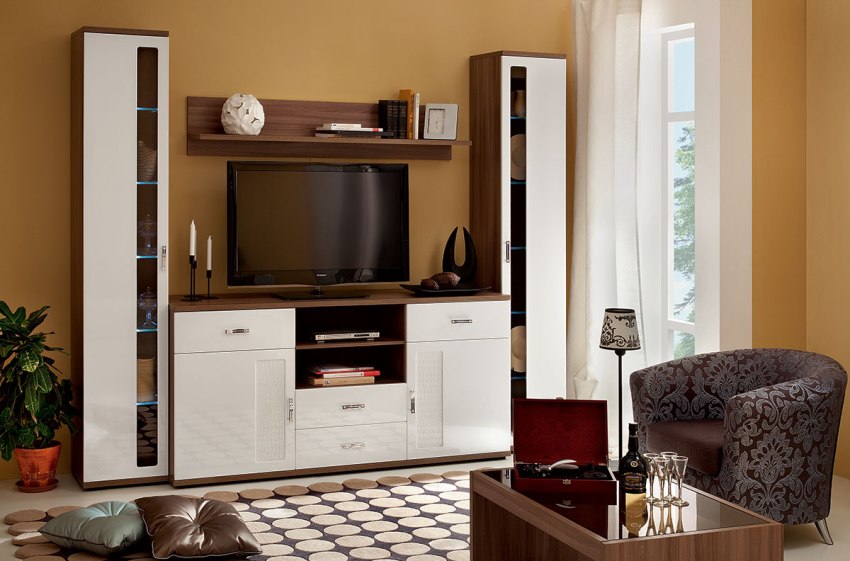 En la versión estándar del tobogán lineal lineal de muebles en la sala de estar, hay varios armarios, estantes abiertos y cerrados, un mueble de televisión, que es el elemento central de los auriculares. Todos sus demás componentes están dispuestos simétricamente. Los elementos altos se instalan primero. El resto se coloca más cerca de los bordes a medida que descienden. Esta disposición hace que la sala de estar sea visualmente más alta.