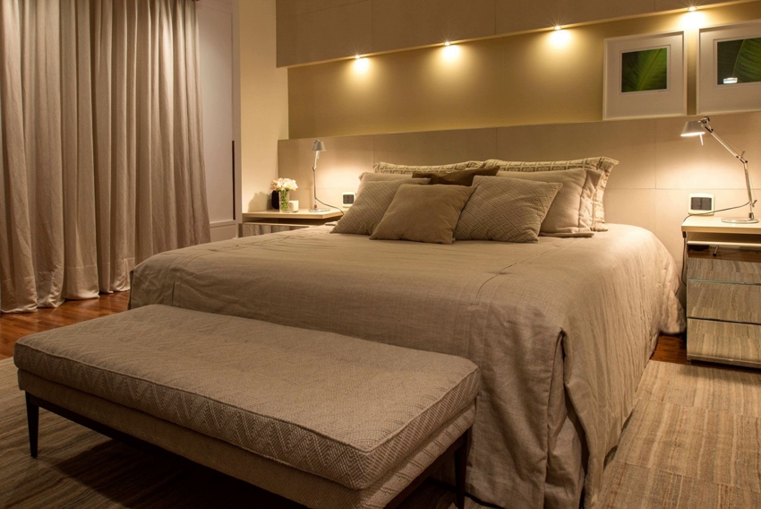 ¡Aviso util! La cantidad de lámparas depende del tipo de actividades adicionales en el dormitorio. Si planea organizar una oficina en la habitación, debe ocuparse de iluminar esta zona.