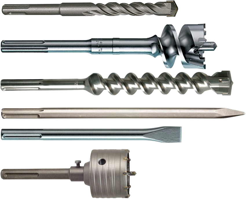 El empaque de concreto se puede clasificar según la versión de vástago. El tipo más popular es el taladro de martillo perforador SDS Plus, que se utiliza a menudo para herramientas domésticas y semiprofesionales. Está equipado con un vástago de 10 mm de diámetro, que es una base cilíndrica ranurada. Estas muescas son necesarias para conectar de forma segura el consumible a la herramienta.