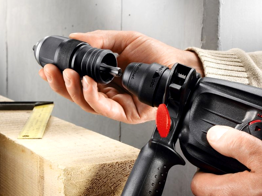 Luego, el taladro con algo de esfuerzo se fija en el portabrocas para el taladro percutor con vástago. Si escucha un clic, la punta está instalada correctamente. Sin embargo, para el control, debe intentar tirar del taladro hacia atrás, lo que no debe realizarse. Si hay juego, se debe reemplazar el cartucho.