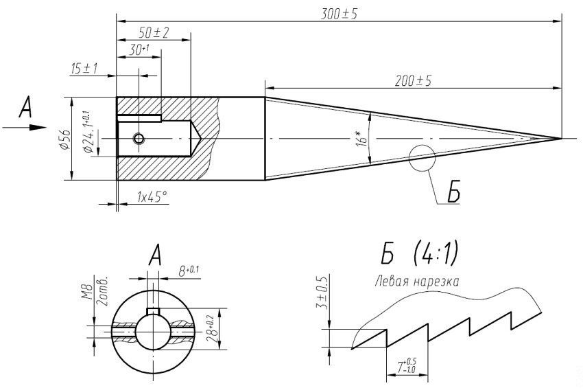 La cuchilla de cono, con o sin rosca, se utiliza a menudo en modelos diesel o eléctricos. Su ventaja es que el cañón se divide no solo por la presión mecánica, sino también por la rotación de la punta de la cuchilla. Está atornillado al tronco, por lo que no se necesita demasiada fuerza para dividir la pieza de trabajo. De esta manera, ahorra combustible para la unidad. Es muy fácil encontrar dibujos de un partidor de madera de tornillo en Internet, sus componentes no son costosos y el montaje no le llevará mucho tiempo.