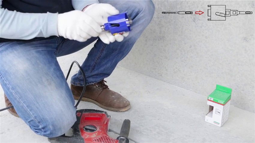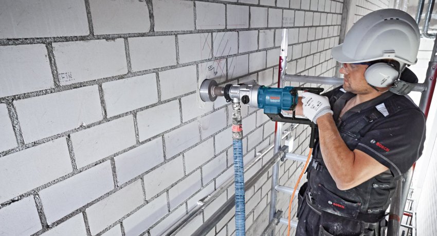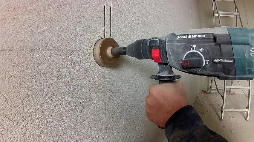 Al hacer agujeros de diámetro y profundidad significativos, la máquina perforadora se puede asegurar con anclajes. Esta posición promueve una perforación más precisa, no genera mucho polvo, evita el agarrotamiento del cilindro y reduce el ruido. Los orificios para las cajas de enchufes a menudo se hacen manualmente.