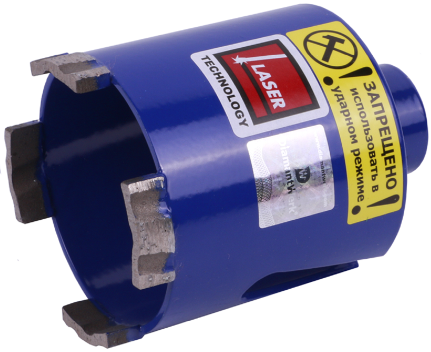 Se utilizan brocas de diamante para hormigón de 72 mm cuando se trabaja en modo sin impacto. Se pueden utilizar para perforar hormigón, hormigón armado, piedra natural y artificial, cerámica. La potencia recomendada del dispositivo giratorio es de 700 W y más, la velocidad de rotación es de 1500-2000 rpm. Los fragmentos de corte de los cortadores están soldados con láser, lo que mejora aún más la resistencia de la boquilla.