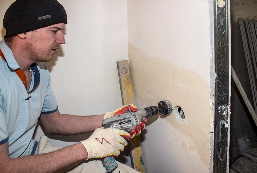 Para determinar el centro, primero debe hacer una marca cruciforme en la pared con una cinta métrica y un lápiz. Luego, debe delinear el círculo propuesto, hacer cuatro agujeros con un taladro en la intersección del círculo y las líneas de marcado rectas, así como en el centro. Después de eso, necesitará un cortador de concreto especial, es decir, una corona.
