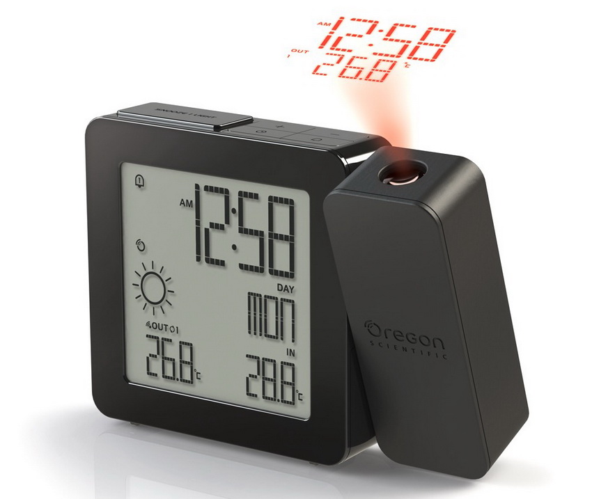un conjunto de funciones. El modelo del complejo meteorológico BAR368P PROJI de Oregon Scientific es un dispositivo de monitoreo del clima y un reloj de proyección combinados en un solo dispositivo. Gracias a esta combinación, es posible conocer toda la información de una sola vez con un vistazo al reloj de la estación meteorológica con el proyector de tiempo. El dispositivo proporciona un ajuste manual del ángulo de proyección con una desviación de 180 °.