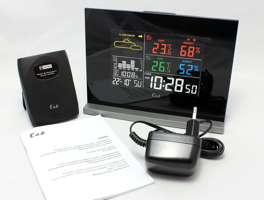 - estación meteorológica EA2 BL508: el modelo tiene una elegante carcasa negra de menos de 20 mm de grosor. Estos dispositivos están disponibles en una caja de plástico de aluminio o gris con un marco de metal alrededor de la pantalla. Gracias a una pata de apoyo especial, se puede instalar sobre una superficie plana. El dispositivo está equipado con un sensor inalámbrico. El complejo meteorológico registra la temperatura en exteriores e interiores, con el registro de indicadores máximos y mínimos, así como humedad, presión. Muestra un gráfico de presión y un pronóstico para el día y las 12 horas mediante símbolos meteorológicos. Los servicios adicionales incluyen un calendario en ocho idiomas (incluido ruso, inglés), un reloj despertador con una opción de "suspensión breve", retroiluminación azul;