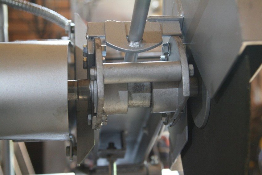 - Se hace un eje, en el que se fijará la polea de transmisión y también se instalará el disco de corte. La unidad está sujeta a montaje y posterior instalación en péndulo. En este caso, la parte superior móvil de la estructura actúa como péndulo, donde se ubican el elemento de corte y el motor.
