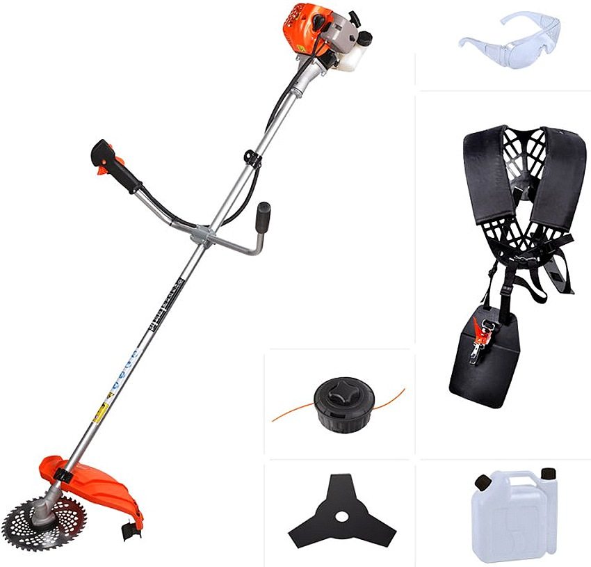 El ancho de corte es de 40 cm y la cuchilla tiene una velocidad de 5050 rpm. Si es necesario, el mango se puede ajustar en altura a su discreción. El juego de corte consta de una línea y un cuchillo. El peso total de la trenza de gasolina es de 5,4 kg.