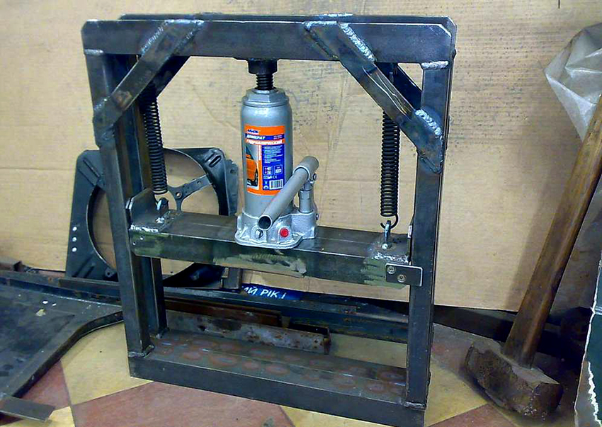 Para hacer un dispositivo casero, puede usar el esquema de la prensa hidráulica de un gato, que se puede encontrar en Internet. En la primera etapa, se crea un marco de estructura a partir de un tubo perfilado de acero, esquinas metálicas y una placa. Se instala un gato entre la placa de empuje y la plataforma, y es necesario que, cuando se retrae, la punta de la varilla esté dentro del retenedor. La base de la herramienta está atornillada al tope móvil.