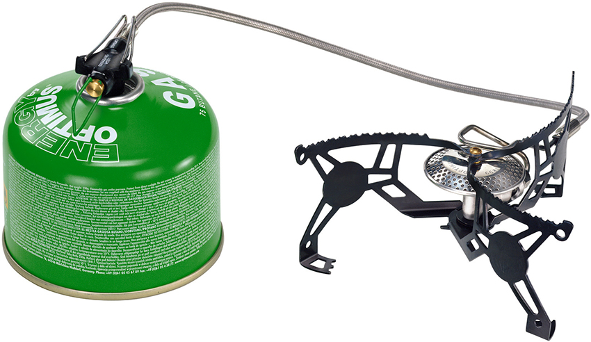 En este caso, se utiliza una manguera flexible para conectar el quemador de gas turístico al cilindro. Dichos diseños no solo consumen combustible de manera eficiente en condiciones climáticas adversas, sino que también permiten el uso de platos pesados y espaciosos. Hay beneficios adicionales por tener una manguera flexible. El cilindro de gas se puede calentar manualmente colocándolo en un recipiente con agua tibia o colocándolo en un saco de dormir si se cocina en el vestíbulo de la tienda.