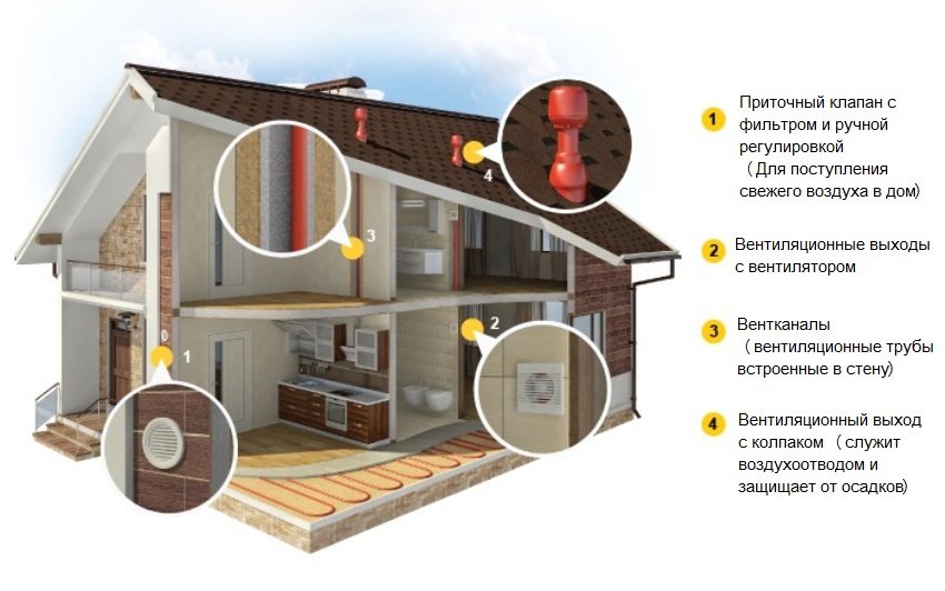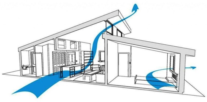 Ventilación natural en una casa particular. consiste en el hecho de que se colocan canales especiales en las paredes a través de los cuales circula el aire en todas las habitaciones, así como en el área de la chimenea. Debido a las diferentes densidades de aire caliente y frío, se produce un movimiento natural de los flujos de aire.