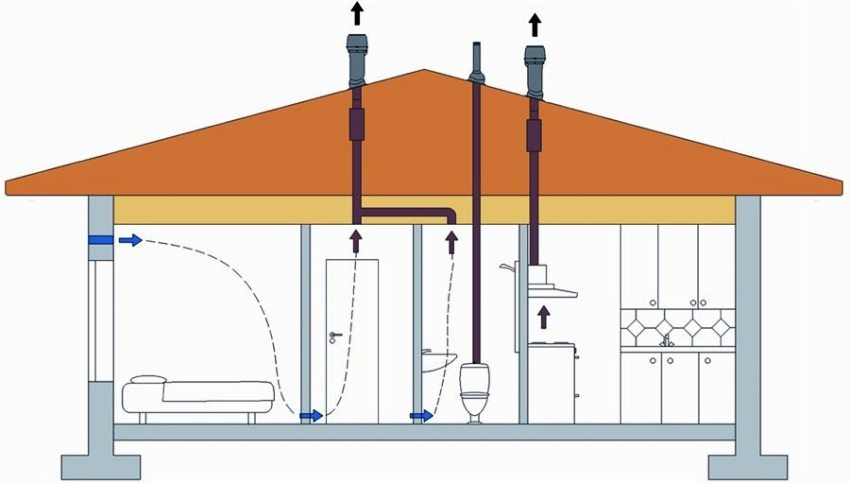 El diagrama de ventilación natural en una casa particular muestra la ubicación de los conductos de aire verticales que comienzan en la habitación ventilada y suben hasta la cumbrera del techo.