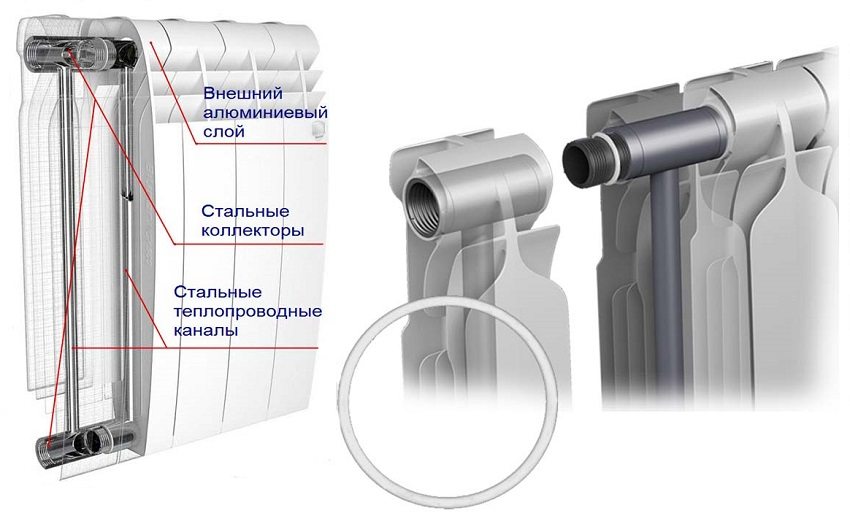 Y tal dispositivo son radiadores bimetálicos. De todos los radiadores diseñados para sistemas de calentamiento de agua, estos productos son los más duraderos. El diseño moderno engaña ya que su superficie está adornada con aluminio, y parece que lo es. Solo puede comprender la diferencia si verifica el peso. El bimetal pesará aproximadamente la mitad. Pero esto no afecta la instalación de radiadores de calefacción. Lo principal es que los sujetadores son confiables. No hay restricciones sobre el tipo de sistema de calefacción para estas baterías.