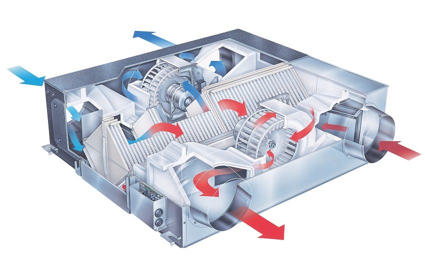 Este sistema está diseñado de tal manera que en invierno, el flujo de aire caliente de escape no se descarga simplemente al exterior, sino que pasa a través de la unidad de intercambio de calor y cede su calor al aire frío entrante. Como resultado, la habitación está saturada de aire fresco, pero ya cálido. En verano tiene lugar el proceso inverso, en el que el aire entrante ya está enfriado. Además, el esquema de instalación es tal que ambos flujos (entrantes y salientes) no se mezclan entre sí.