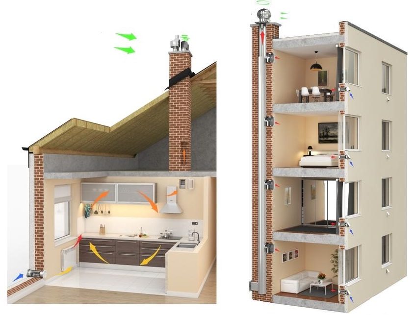 Disposición del suministro natural y la ventilación por extracción en una casa privada y un edificio de varios pisos.
