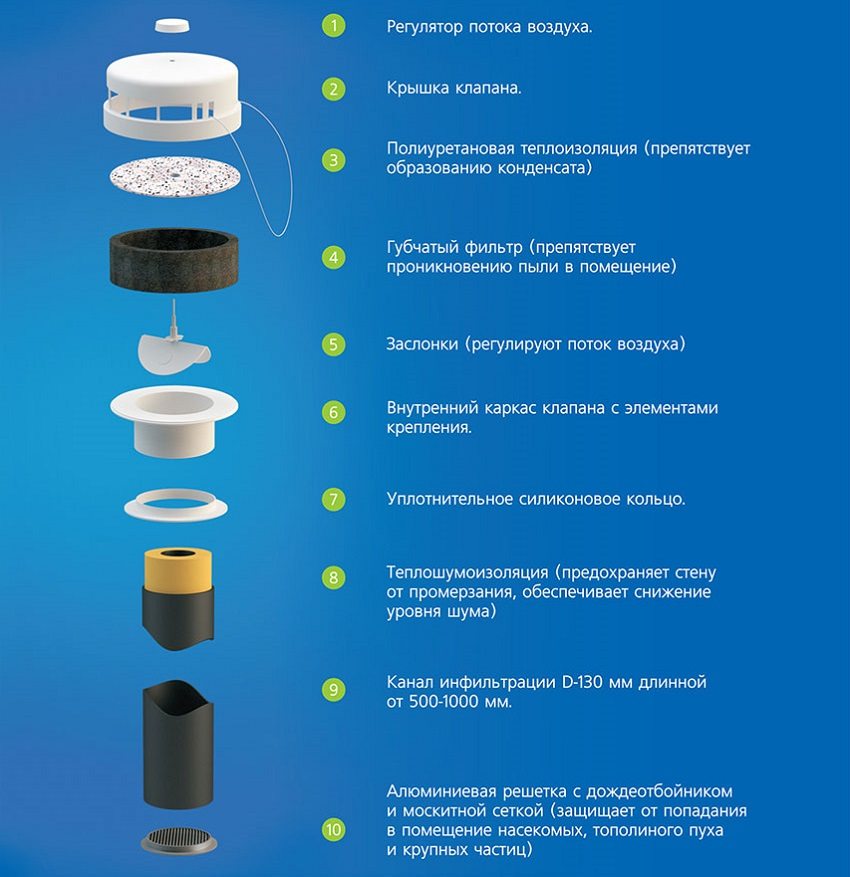 La función principal de la válvula de suministro es proporcionar constantemente aire fresco de la calle, y el aire que ingresa a través de la válvula ya estará purificado. Además, la válvula protege contra el ruido, lo que es imposible con las rejillas de ventilación abiertas: interior tubo plástico hay una junta de material de insonorización. El suministro de aire en clima frío no reducirá la temperatura ambiente si elige un lugar para montar la válvula de suministro en la pared sobre el radiador.
