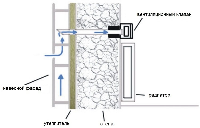 El principio de funcionamiento de la válvula de suministro en una pared con calefacción es el siguiente: el aire de la calle ingresa a través de la parrilla a una tubería montada en la pared y equipada con aislamiento acústico. Luego, el aire se purifica con un filtro grueso. Debido a la forma de la válvula, se reduce el nivel de ruido y el caudal de aire directamente en la habitación. El flujo regulado por la compuerta se dirige al radiador de calefacción y el aire ya caliente se distribuye por toda la habitación. Entonces, con la ayuda de una válvula de pared, el intercambio de aire está asegurado en cualquier época del año, incluso en condiciones de frío extremo.