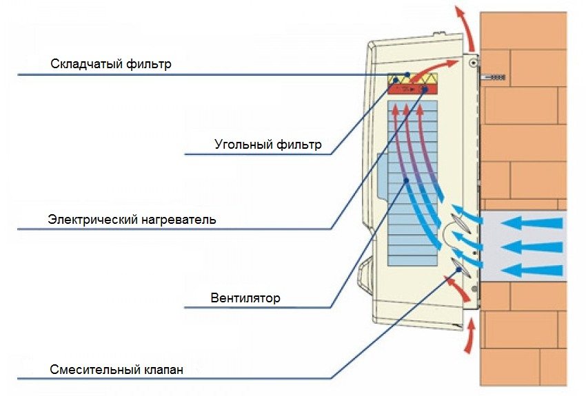 - Calentador: el aire de suministro se puede calentar. Esto es especialmente cierto en la temporada de invierno. Si el calentamiento se produce desde la red, este tipo se llama eléctrico. Si la calefacción proviene de un sistema de calefacción central, es del tipo agua.