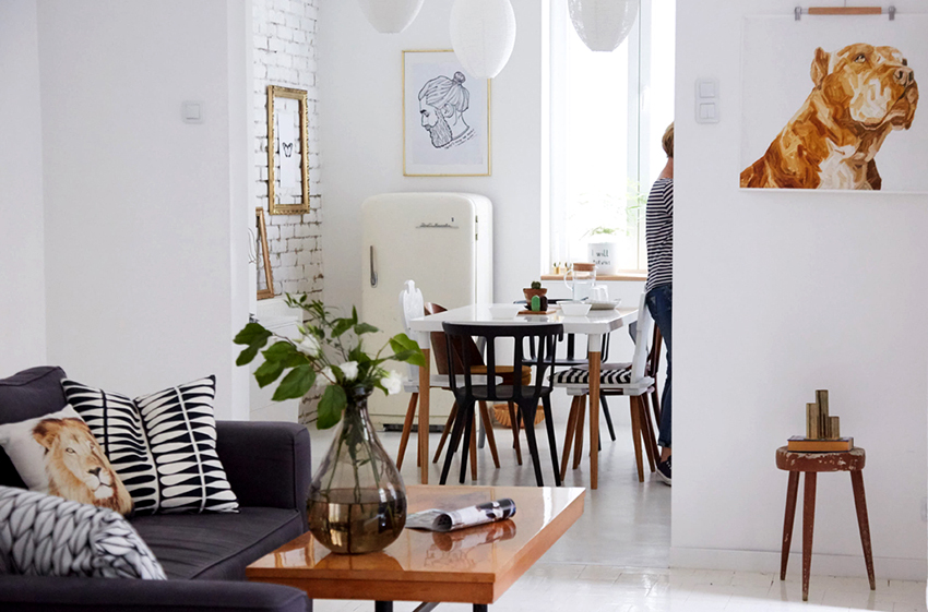 - Puede diluir el interior blanco con decoración, por ejemplo, usando diferentes toallas de cocina y agarraderas, manteles, flores en hermosas macetas.