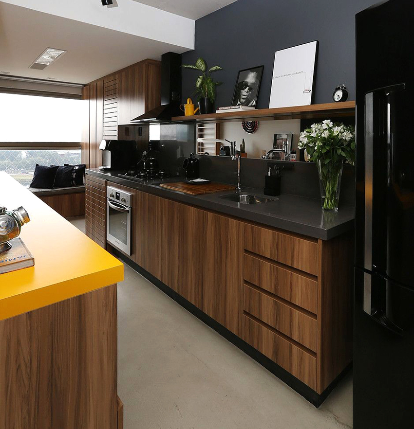 Una cocina en la que el color de los auriculares contrasta con el suelo y los techos se ve bastante impresionante