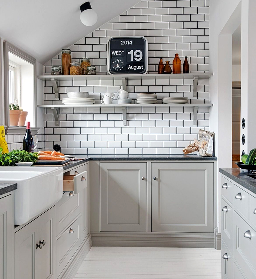 - Pequeños dibujos en las paredes, monocromáticos o con patrones de líneas brillantes agregarán ambiente a la cocina y diluirán el interior.