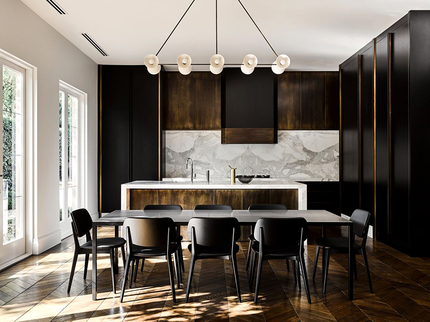 - Auriculares oscuros o negros. No debe comprar gabinetes de cocina completamente negros: una cocina en blanco y negro se ve hermosa, donde los gabinetes inferiores están hechos en negro y los superiores en blanco. En Internet, puede encontrar muchas fotos de cocinas negras con encimeras blancas.