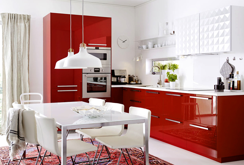 La condición principal para organizar el interior de una cocina es elegir la combinación de colores correcta. Si observa fotos de cocinas rojas y blancas, debe prestar atención a que cuanto más espaciosa sea la habitación, más rojo se puede usar en ella. En una habitación más pequeña, se debe dar preferencia a un auricular blanco con varias puertas delanteras rojas.