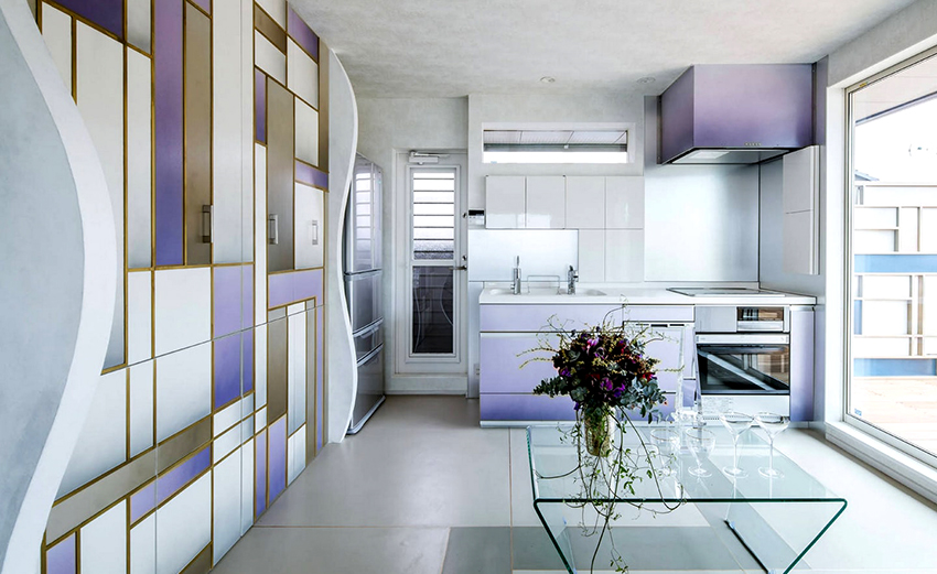 Al organizar una cocina, no es necesario intentar hacer todas las superficies en una paleta de colores. De manera correcta y armoniosa, puede organizar una habitación utilizando colores contrastantes y tonos completamente diferentes. Por ejemplo, se recomienda combinar colores azul y amarillo en el interior de la cocina, que realzan el brillo entre sí. Otra opción orgánica es la combinación de rojo y morado, que fluyen suavemente entre sí, creando composiciones exitosas.