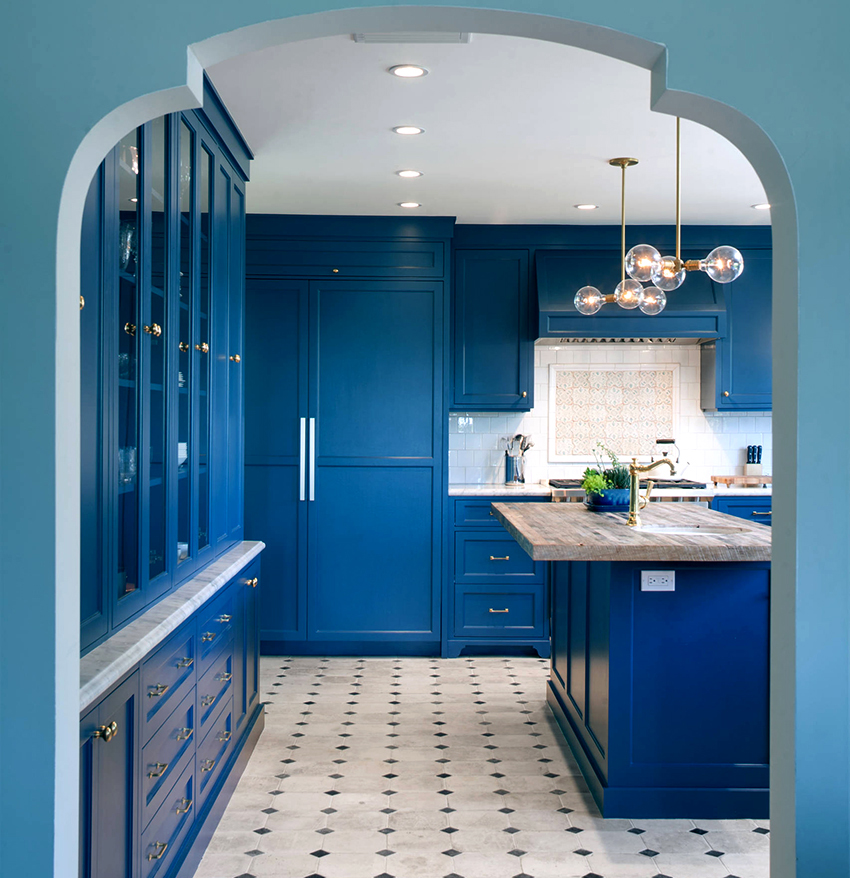 Los psicólogos señalan que el uso de azul en el interior tiene un efecto relajante y calmante, y tiene un efecto positivo en la reducción de la presión. Sin embargo, si usa un azul demasiado oscuro en el diseño de su cocina o, por el contrario, demasiado saturado, estos tonos pueden suprimir el apetito y actuar al revés.
