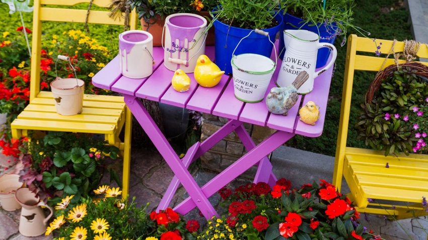 Puede utilizar colores brillantes y saturados para cubrir los muebles de jardín. pinturas para madera, que permitirá no solo decorar el sitio, sino también proteger los objetos de factores externos de influencia