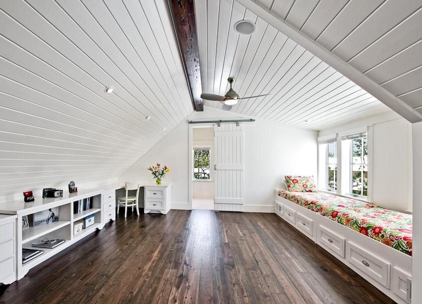 Los tintes de lujo del fabricante Tikkurila son adecuados para el acabado de paredes y techos de madera en salas de estar.