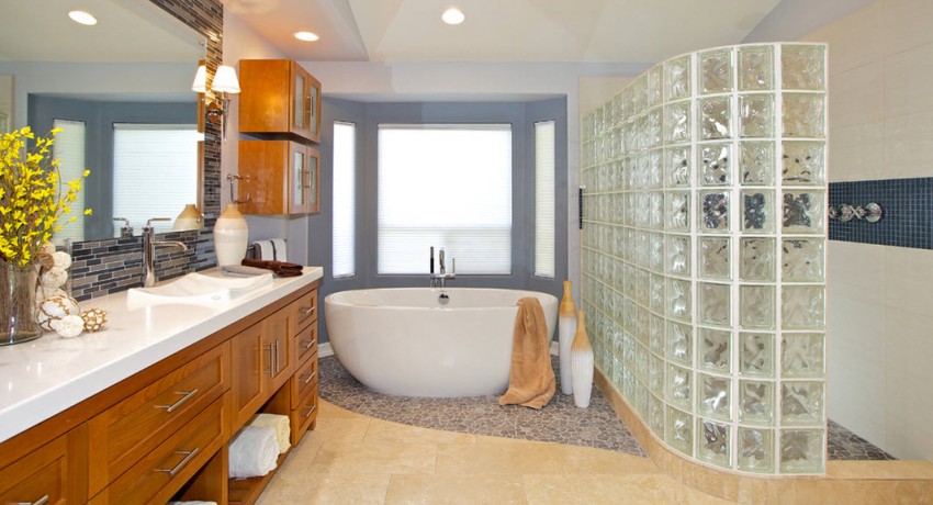Con la ayuda de bloques de vidrio en el baño, las fotos lo confirman claramente, puede separar el inodoro y organizar un área de relajación en el baño, que es una solución racional para baños combinados. Aquí es mejor usar productos mate que sean lo suficientemente impermeables y no sobrecarguen visualmente la habitación. En este caso, la partición debe ser recta o curva, llegar a la mitad de la altura de la habitación o llegar al techo.