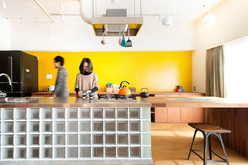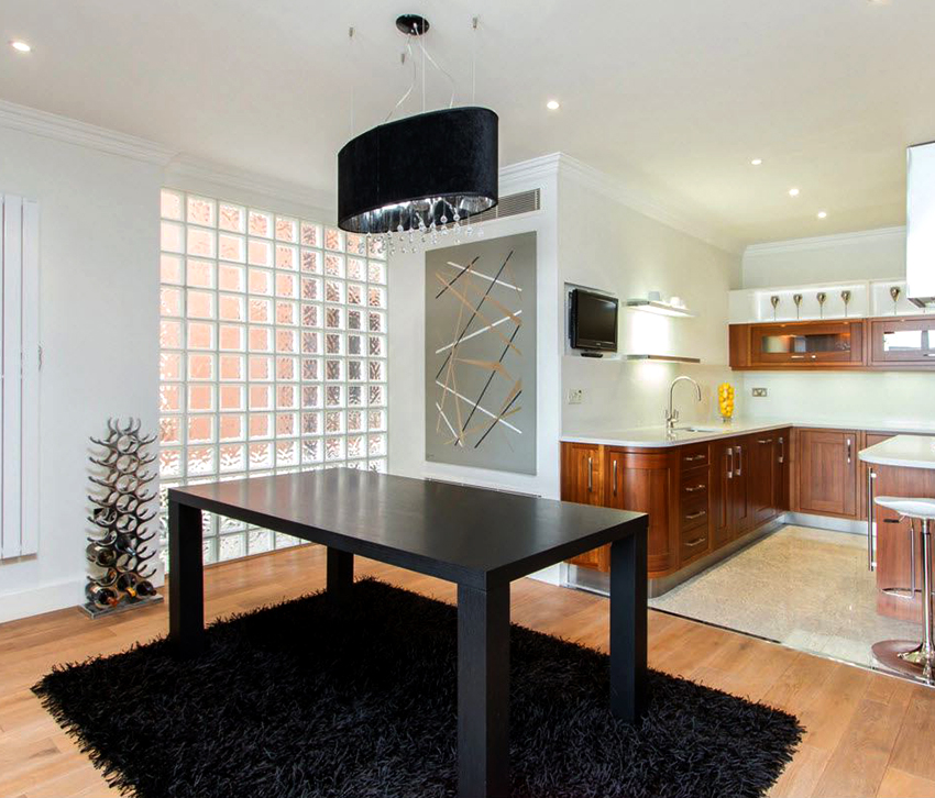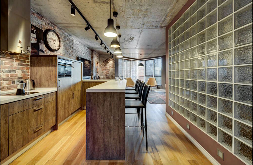 Al elegir el tipo de bloque de vidrio para crear una partición, se debe tener en cuenta el propósito de la habitación, ya que los elementos individuales difieren en el grado de transmisión de luz y la naturaleza del efecto de dispersión de la luz. La construcción de vidrio transparente es ideal para crear un área de comedor en la cocina.