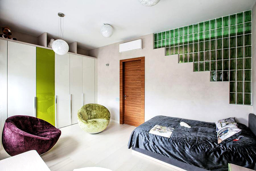 Para cercar un lugar acogedor para dormir en la sala de estar, es mejor usar elementos mate. En el dormitorio, se puede utilizar una mampara de vidrio multicolor para separar la zona del tocador o el armario. Además, el diseño encajará idealmente en una habitación combinada con un baño, para lo cual es adecuada cualquier versión de bloques de vidrio.