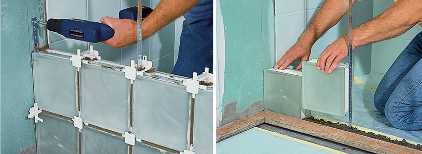 Antes de proceder a la instalación de bloques de vidrio, es necesario limpiar la base y realizar el marcado teniendo en cuenta el tamaño del producto y el grosor de las juntas. Para determinar las dimensiones del marco, se debe colocar una fila de bloques con cruces entre ellos. A continuación, se lleva a cabo la instalación de un marco metálico guía del ancho y alto requerido, que se fija a las paredes de cerramiento, al piso y, si es necesario, al techo mediante tacos de 50 cm de largo. Durante el proceso de instalación, es importante monitorear constantemente la posición horizontal y vertical del módulo.