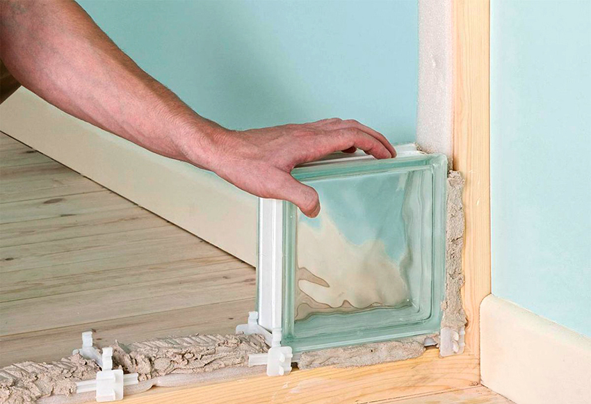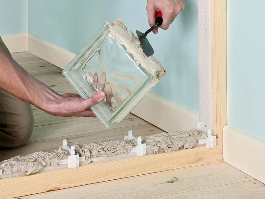 Después de preparar la superficie, debe comenzar a colocar los bloques de vidrio. La primera fila comienza desde la pared. En la parte inferior de la superficie horizontal y el lateral de la guía de perfil vertical se aplica una composición adhesiva con un espesor de no más de 1 cm, a continuación se instala el primer bloque, que se presiona en la solución. Se aplica una mezcla adhesiva a su superficie lateral y se instala el siguiente elemento. Las cruces de montaje se colocan entre ellos en ambos lados, cuyas dimensiones corresponden al grosor de la costura. La fila continúa hasta que se detiene en una guía vertical ubicada en la pared opuesta.