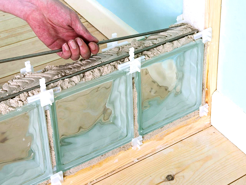 Si el cuarto de ducha está hecho de bloques de vidrio no lineales, se debe instalar una malla de refuerzo más gruesa, lo que evitará que la estructura compleja se mueva y la mampostería en sí tendrá una apariencia más ordenada. Las varillas horizontales deben doblarse en la forma deseada. En este caso, las cruces de montaje están ubicadas exclusivamente en el interior de la mampostería.