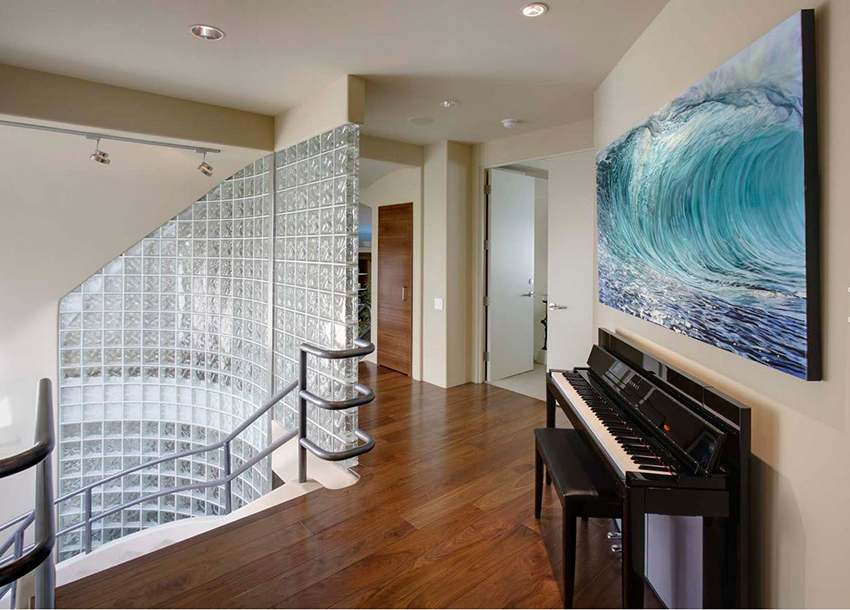 Una solución original es decorar la superficie adyacente a las escaleras que conducen al segundo piso, que se muestra claramente en la foto de la pared hecha de bloques de vidrio. Una chimenea falsa en la sala de estar se verá única. Con la ayuda de bloques de vidrio, también puede colocar un nicho en la pared, que sin duda llamará la atención sobre los elementos que se encuentran en él.