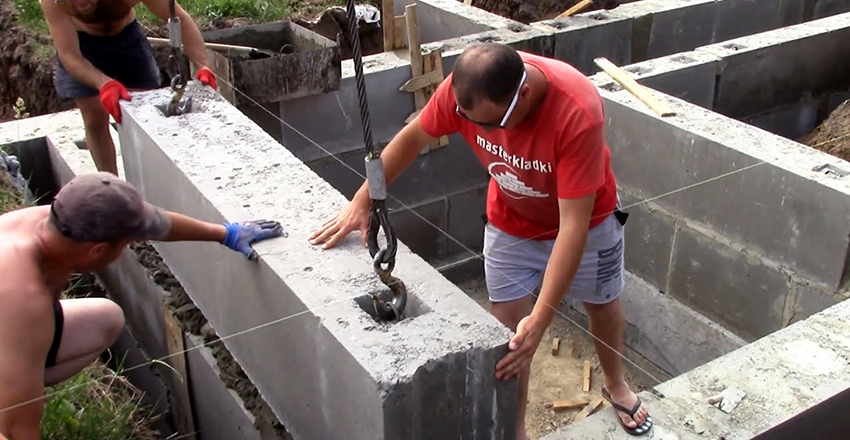 Dado que los bloques de hormigón para las paredes del sótano tienen el peso suficiente, se colocan con el uso de una grúa. Los elementos de esquina se colocan sobre la impermeabilización. Los bloques de hormigón se colocan de acuerdo con el principio de erigir una pared de ladrillos. Para unir los elementos se utiliza un mortero de mampostería de 2 cm de espesor, comprobando la horizontalidad de cada fila.